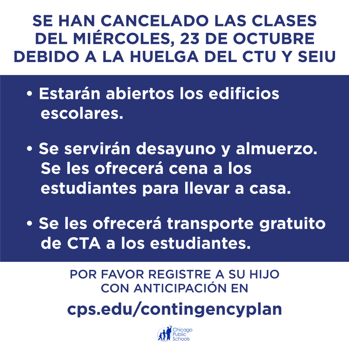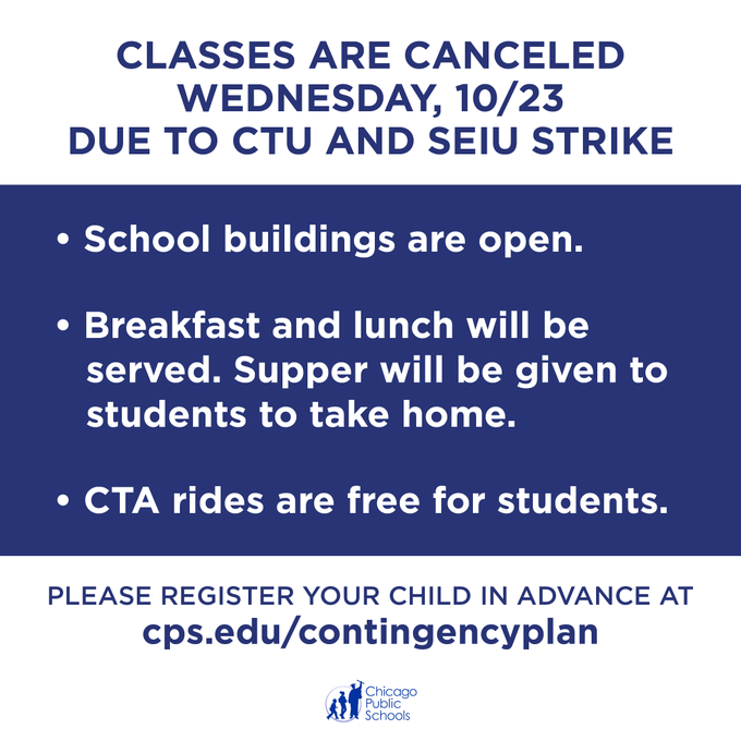 As of 4 p.m., CTU has not scheduled a House of Delegates vote, which would be necessary to end their strike. As a result, it will not be possible to hold classes tomorrow, Wednesday, 10/23. After school activities will not be available. http://cps.edu/contingencyplan