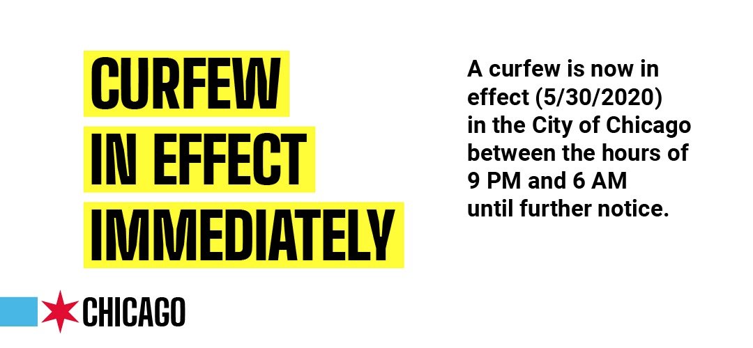 CURFEW IN EFFECT: Until further notice, a curfew between the hours of 9PM and 6AM is now in effect in the City of Chicago. Please stay safe.