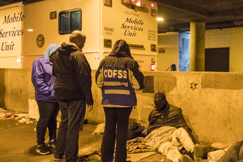 A member of Chicago Department of Family & Support Services speaks to a homeless man who resides in “The Triangle” about services that are available to him.