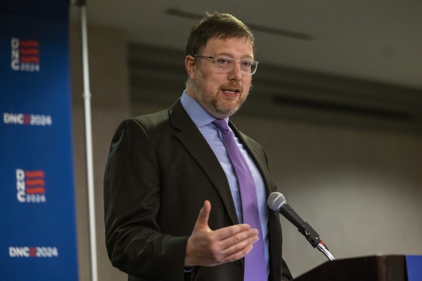 Ben Wikler, chair of the Democratic Party of Wisconsin, discusses the 2024 Democratic National Convention during a news conference at the Hilton Chicago on Thursday.
