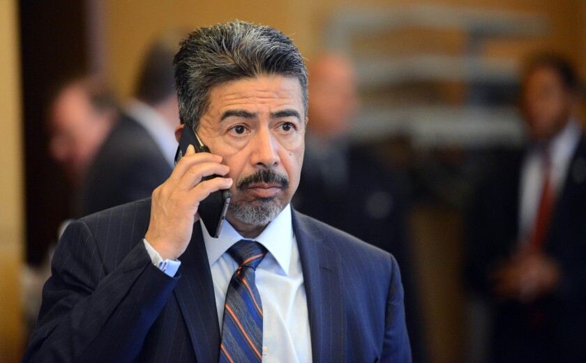Then-Ald. Danny Solis talks on the phone outside of the Council Chambers at City Hall. Thursday, September 24, 2015.