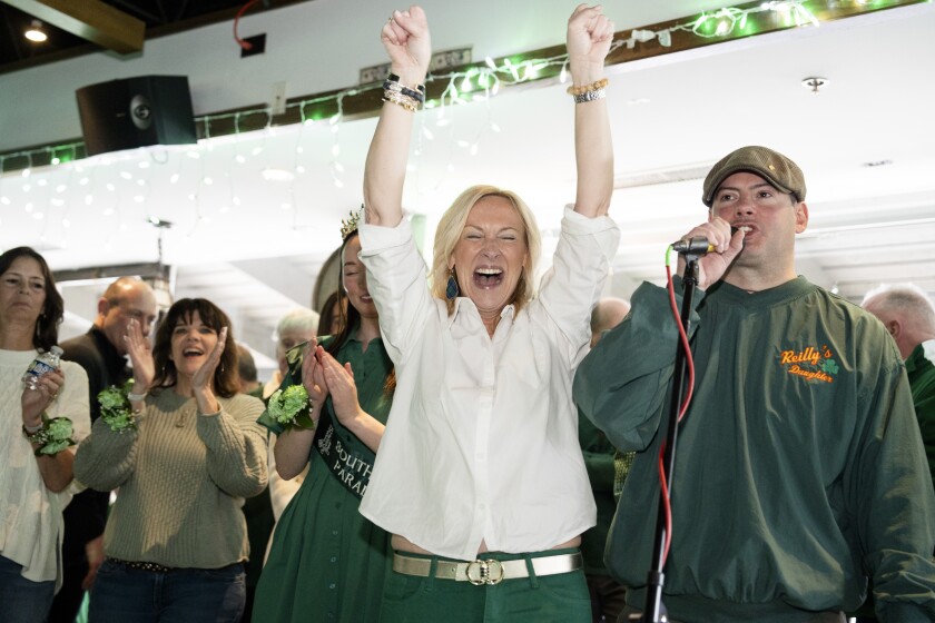 Lorraine O’Malley cheers as she is announced as the winner of a trip for two to Ireland during the annual Irish Soda Bread Contest at Reilly’s Daughter pub in Oak Lawn on Saturday. Her daughters are hoping to be her plus one, and so is her sister.